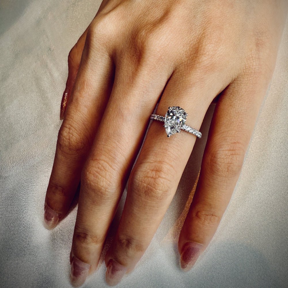 The graceful curves of the pear-cut diamond enhance its brilliance, symbolizing sophistication and individuality. The pavé-set melee diamonds along the band add a radiant touch, complementing the pristine beauty of the Leontine ring with an ethereal glow.