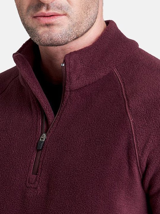 Maroon solid sweatshirt has a high neck, na pockets, long sleeves, half zipper closure, straight hem