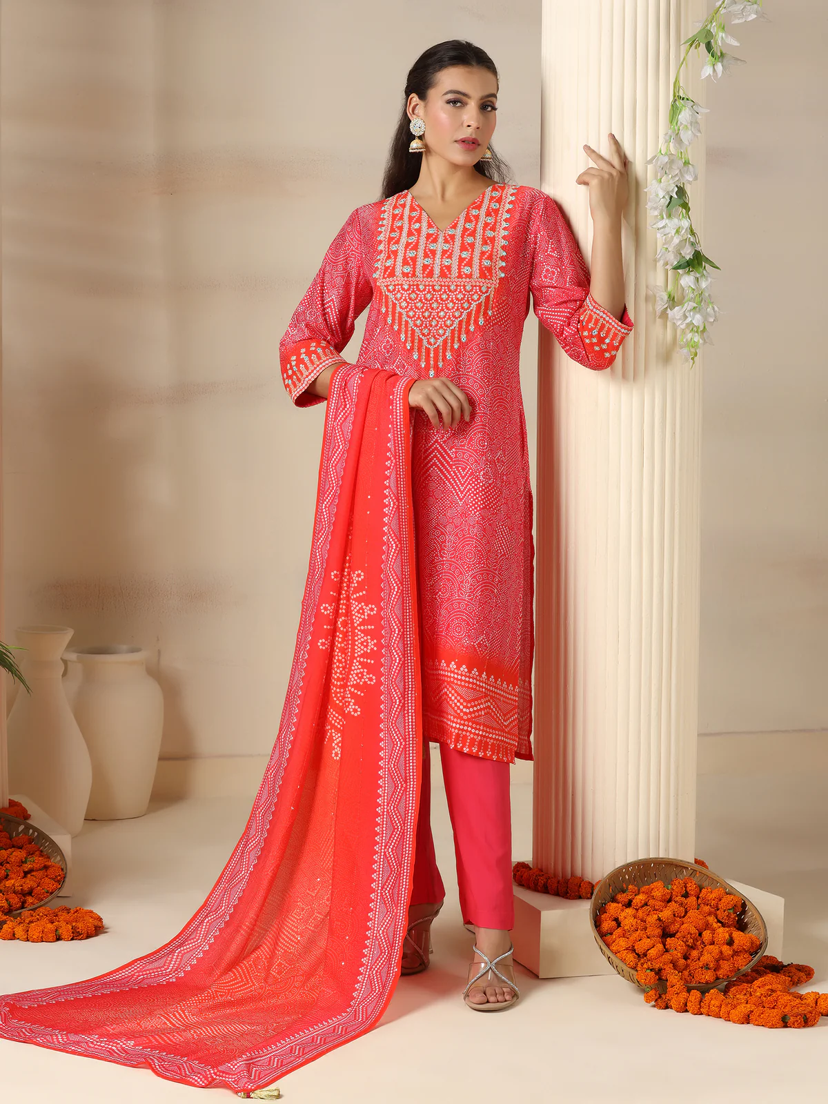 This women's ensemble features a pink Chanderi kurta embellished with traditional Bandhani print and delicate embroidery, paired with comfortable pants and a matching dupatta. Crafted from lightweight Chanderi fabric, it offers a